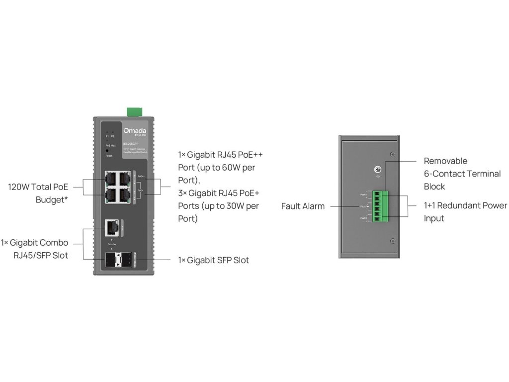Omada 6portový gigabitový průmyslový Easy Managed Switch nabízí 4× gigabitové RJ45 porty, včetně 1× PoE++ a 3× PoE+, které umožňují napájet náročná síťová zařízení přímo přes síťový kabel. Kombinovaný gigabitový RJ45/SFP slot a samostatný SFP slot zajišťují maximální flexibilitu připojení pro různorodé topologie sítě. S napájecím rozpočtem 120 W a možností dodat až 60 W pro PoE++ port je switch ideální pro bezpečnostní kamery, přístupové body či průmyslové IoT zařízení.