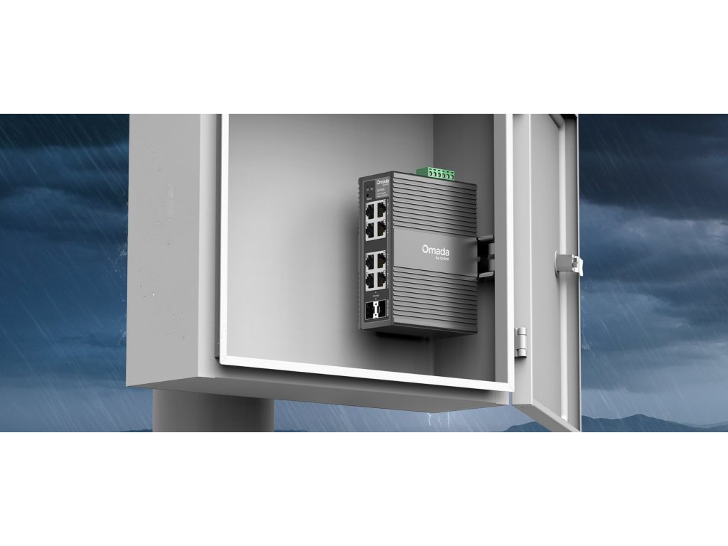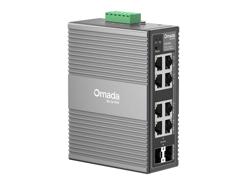 Průmyslový switch 8× gigabit (6 RJ45 + 2 RJ45/SFP), IP40, -40°C až 75°C, 1+1 napájení, VLAN, QoS, Omada cloud správa, monitoring.