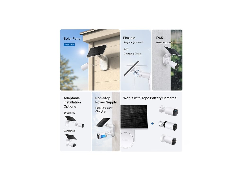 Funguje s bateriovými kamerami Tapo: Kompatibilní se všemi bateriovými kamerami Tapo, což umožňuje celoroční ochranu vaší bateriové kamery Tapo.