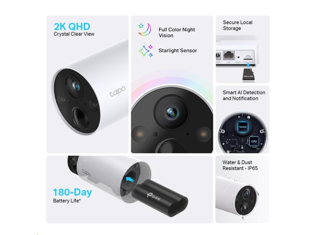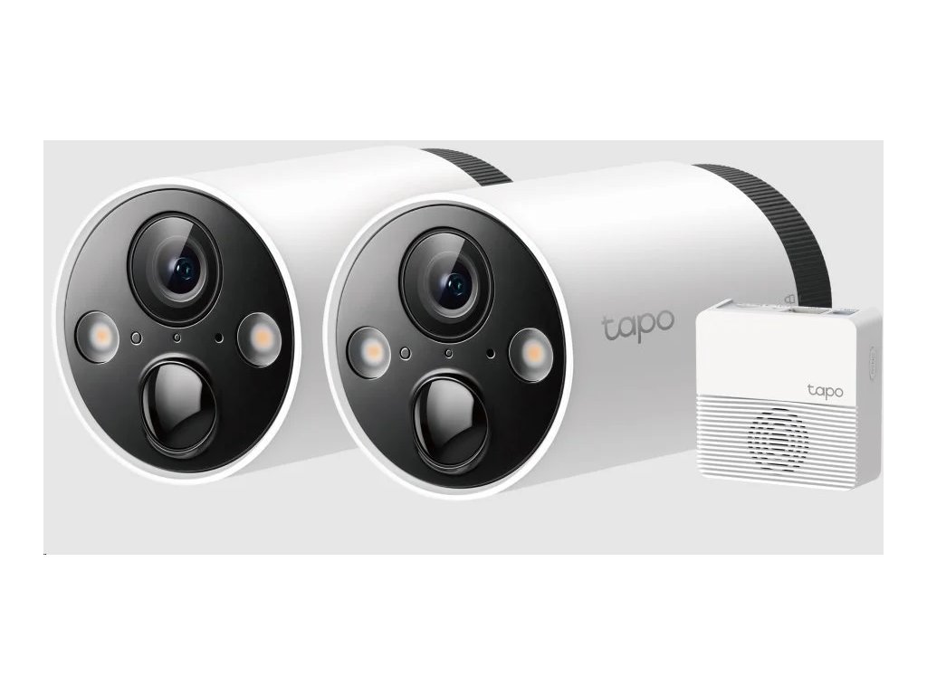 Chytrý bezdrátový systém 2 kamer Tapo, 2K QHD, plnobarevné noční vidění, AI detekce osob/vozidel/zvířat, obousměrný zvuk, alarm, slot na microSD až 512 GB/Cloud, IP65, vyžaduje Tapo Smart Hub.