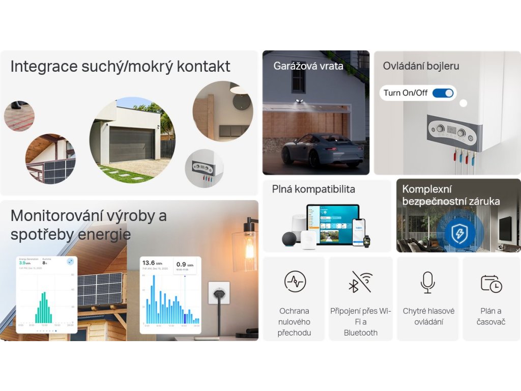 Modul chytrého spínače přináší univerzální režimy ovládání pro každou domácnost či kancelář. Režim bezpotenciálového kontaktu je ideální pro garážová vrata, kotle, závlahy či systémy řízení přístupu, zatímco režim s potenciálovým kontaktem umožňuje snadné ovládání osvětlení, zásuvek či podlahového vytápění bez nutnosti zásahu do stávající instalace. Ovládání garážových vrat je nyní možné i hlasem, na dálku či pomocí unikátního PIN kódu pro vyšší bezpečnost.