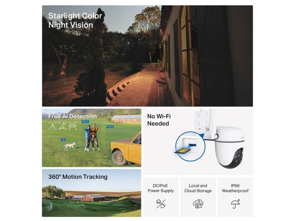 Lokální a cloudové úložiště: Uložení všech důležitých momentů na kartu microSD (až 512 GB) nebo si předplaťte cloudovou službu Tapo Care.