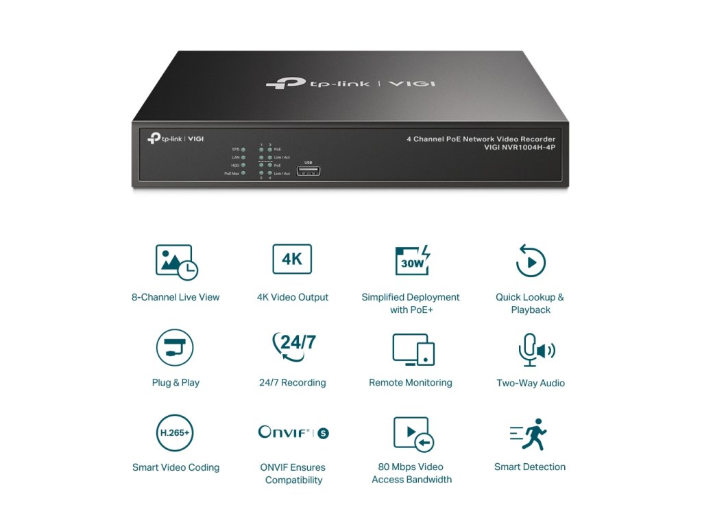Výkonný čtyřkanálový síťový videorekordér, který podporuje až 30 W na každém portu typu PoE+. je navržený pro použití jednoho ethernetového kabelu pro přenos dat i energie. Systém nabízí flexibilní instalaci a nalezne uplatnění při dohledu v malých podnicích, například v potravinách, skladech, restauracích i finančních institucích.