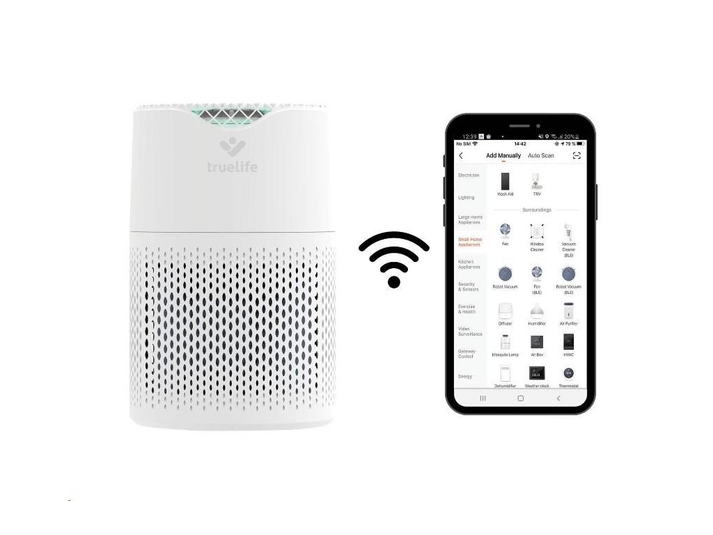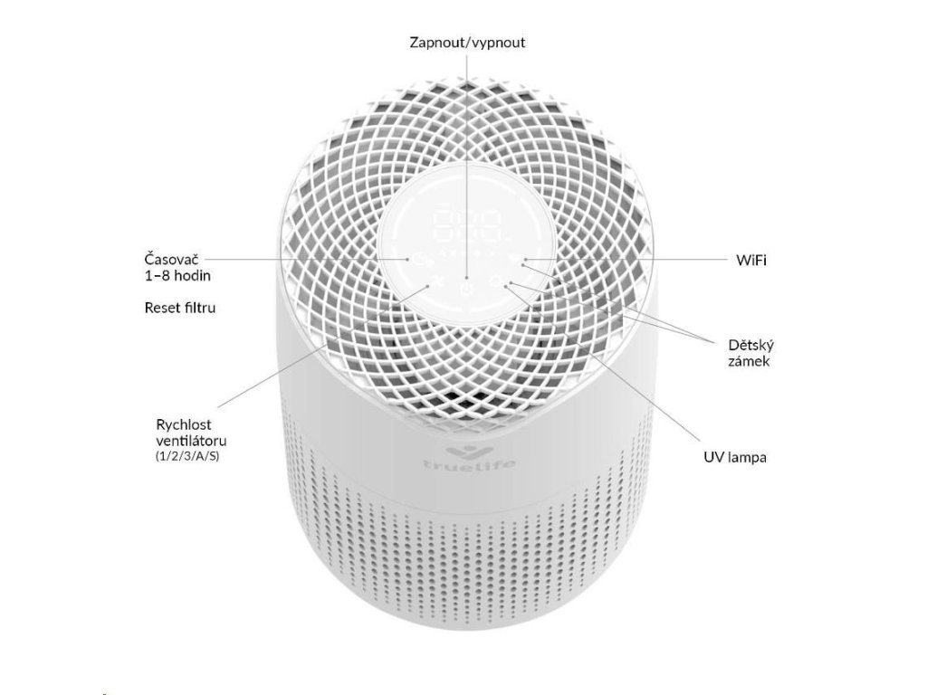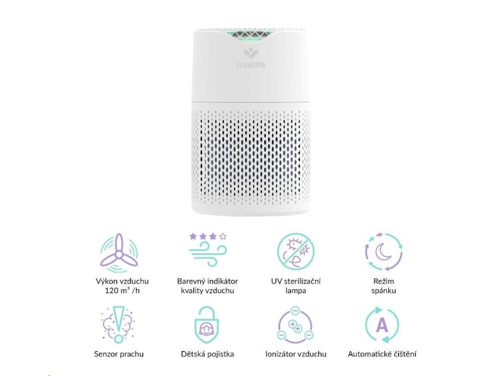 Čistička vzduchu TrueLife vyčistí až 120 m3 vzduchu za hodinu. Je vhodná do místnosti o velikosti 12-18 m2 a díky nízké hmotnosti jí můžete bez obav přenášet. Čistička celkově zlepšuje kvalitu vzduchu, ničí viry, bakterie a další nečistoty a může tak významně pomoci alergikům nebo astmatikům. Čistička je opatřena barevnými indikátory kvality vzduchu, funkcí automatické detekce nečistot a automatického čištění. Bydlíte-li na místě, kde se často práší, potěší vás přítomnost prachového senzoru. 6 násobná filtrace v podobě anti-bakteriálního filtru, HEPA filtru, uhlíkového filtru, katalytického filtru, UV světla a ionizace zachytí až 99,9% polétavého prachu a vyčistí 93,5 % těkavých organických látek. Zároveň zachycuje viry a koronaviry.