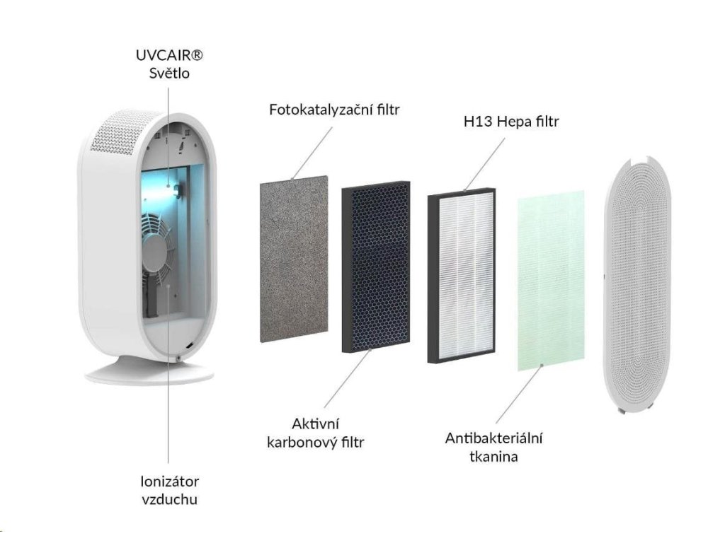 Počet filtrací 6 – anti-bakteriální, HEPA, uhlíková, katalytická, UV světlo, ionizace