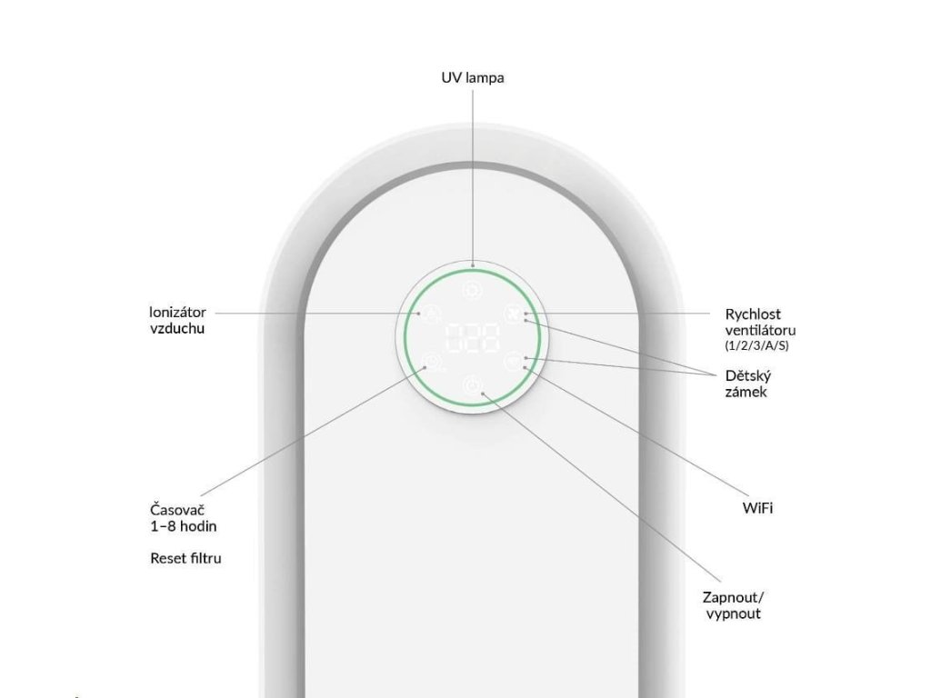 Ovládání čističky vzduchu je velmi jednoduché a intuitivní. Všechny funkce lze nastavit pomocí ikon na dotykovém displeji.