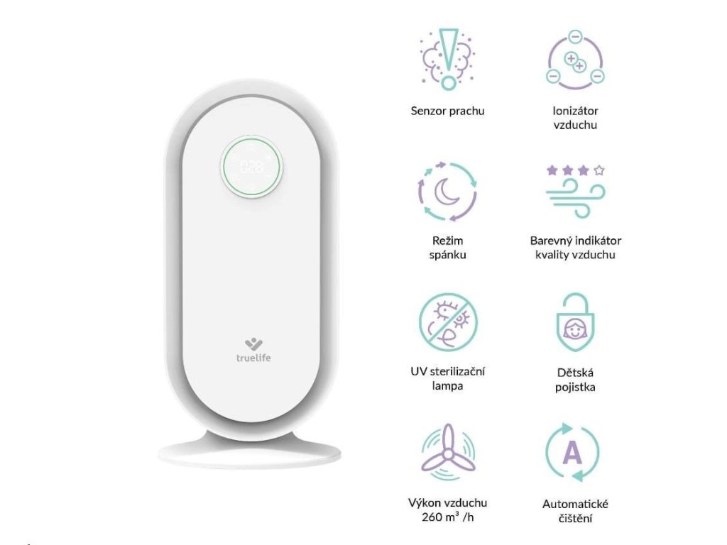 Čistička vzduchu TrueLife vyčistí až 260 m3 vzduchu za hodinu. Je vhodná do místnosti o velikosti 25-30 m2 a díky nízké hmotnosti jí můžete bez obav přenášet. Čistička celkově zlepšuje kvalitu vzduchu, ničí viry, bakterie a další nečistoty a může tak významně pomoci alergikům nebo astmatikům. Čistička je opatřena barevnými indikátory kvality vzduchu, funkcí automatické detekce nečistot a automatického čištění. Bydlíte-li na místě, kde se často práší, potěší vás přítomnost prachového senzoru. 6 násobná filtrace v podobě anti-bakteriálního filtru, HEPA filtru, uhlíkového filtru, katalytického filtru, UV světla a ionizace zachytí až 99,9% polétavého prachu a vyčistí 93,5 % těkavých organických látek. Zároveň zachycuje i viry a koronaviry.
