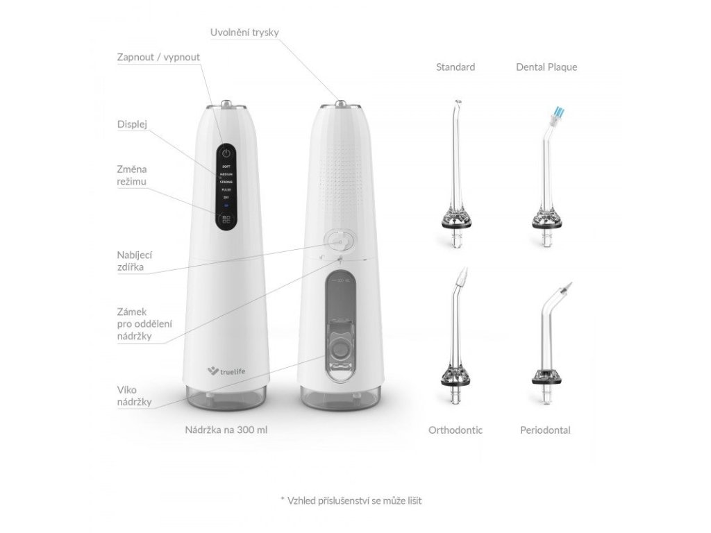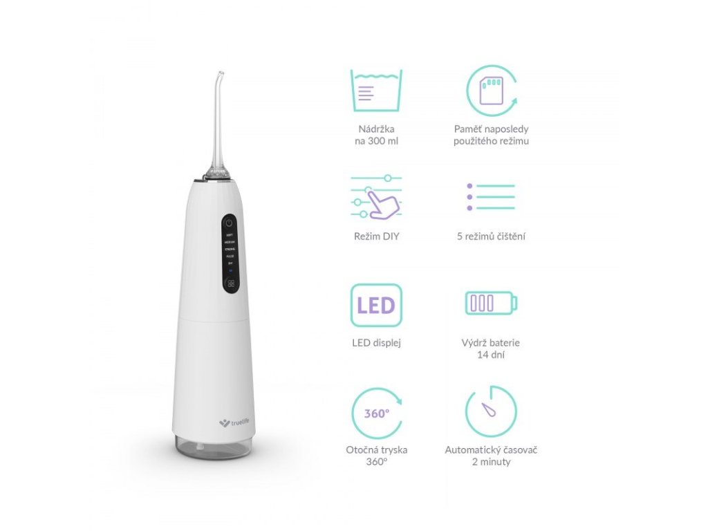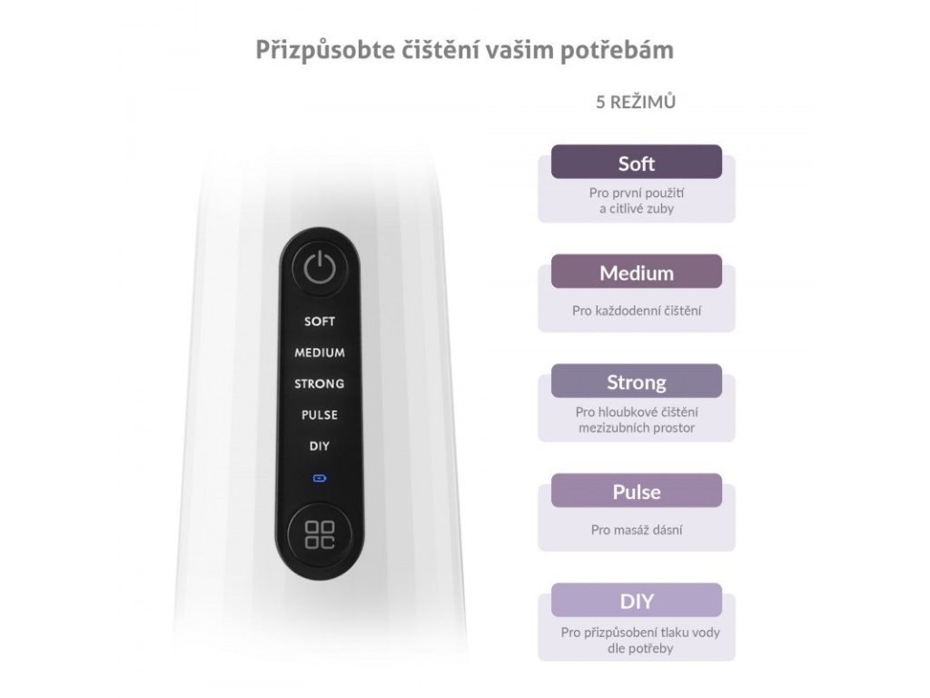 Ústní sprcha šetrně čistící mezizubní prostory, 5 režimů čištění, nádržka 300 ml, mimořádně rychlé plnění shora a z boku , dobíjecí – 14 dní na jedno nabití, kompaktní design, LCD displej, paměť, časovač, 4 trysky v balení, krytí IPX7