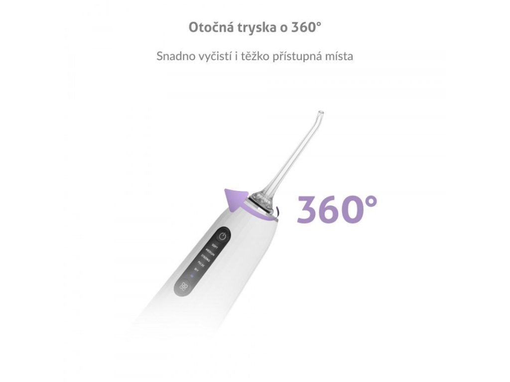 Hlavice trysky je otočná o 360 stupňů, takže snadno vyčistí všechna zákoutí vašich úst.