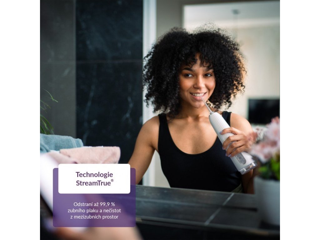 Pravidelné čištění mezizubních prostor funguje jako prevence zubních kazů a díky TrueLife AquaFloss Compact C200 je snazší i šetrnější, než používání zubních nití či mezizubních kartáčků. Pouze shora či z boku naplníte nádržku o objemu 300 ml vodou a zvolíte jeden z 5 přednastavených režimů, přičemž u režimu DIY si svým potřebám přizpůsobíte tlak. Sprcha je také vybavena technologií StreamTrue®, která vhání mikrobublinky tvořené vodou a vzduchem i do těch nejužších prostor a účinně tak odstraňuje zubní plak, bakterie a zbytky jídel.