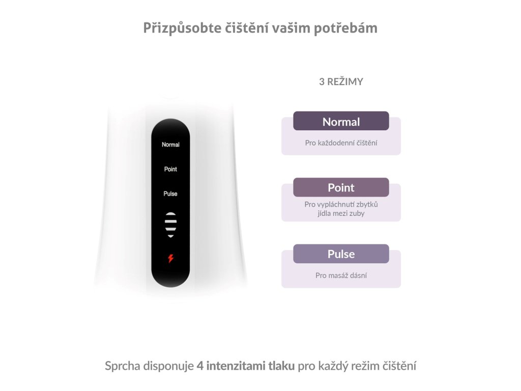Sprcha nabízí 3 režimy čištění s různými intenzitami tlaku (30 – 130 PSI), včetně režimu POINT, který cíleně a účinně odstraní zbytky jídla z mezizubních prostor.