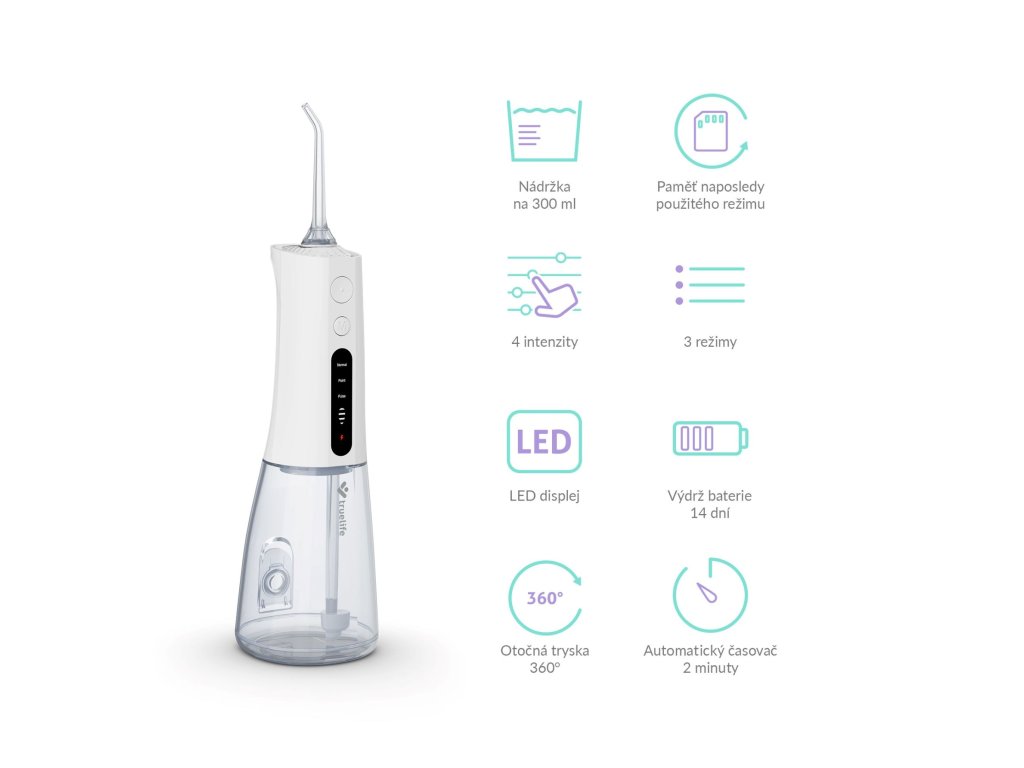 Ústní sprcha pro šetrné čištění mezizubních prostor, 3 režimy čištění, nádržka 300 ml, mimořádně rychlé plnění shora a z boku , dobíjecí – 14 dní na jedno nabití, kompaktní design, displej, paměť, časovač, 6 trysek v balení, krytí IPX7