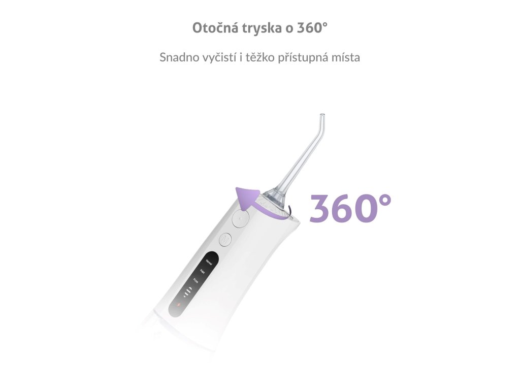 Hlavice trysky je otočná o 360 stupňů, takže snadno vyčistí všechna zákoutí vašich úst.