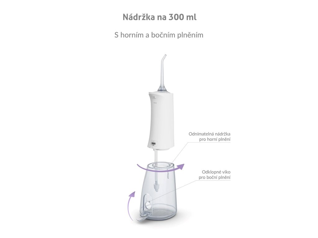 Nádržka o objemu 300 ml vystačí na vyčištění celého chrupu a zároveň je dostatečně kompaktní. Kromě obyčejné vody jí můžete naplnit ústní vodou pro extra svěžest.
