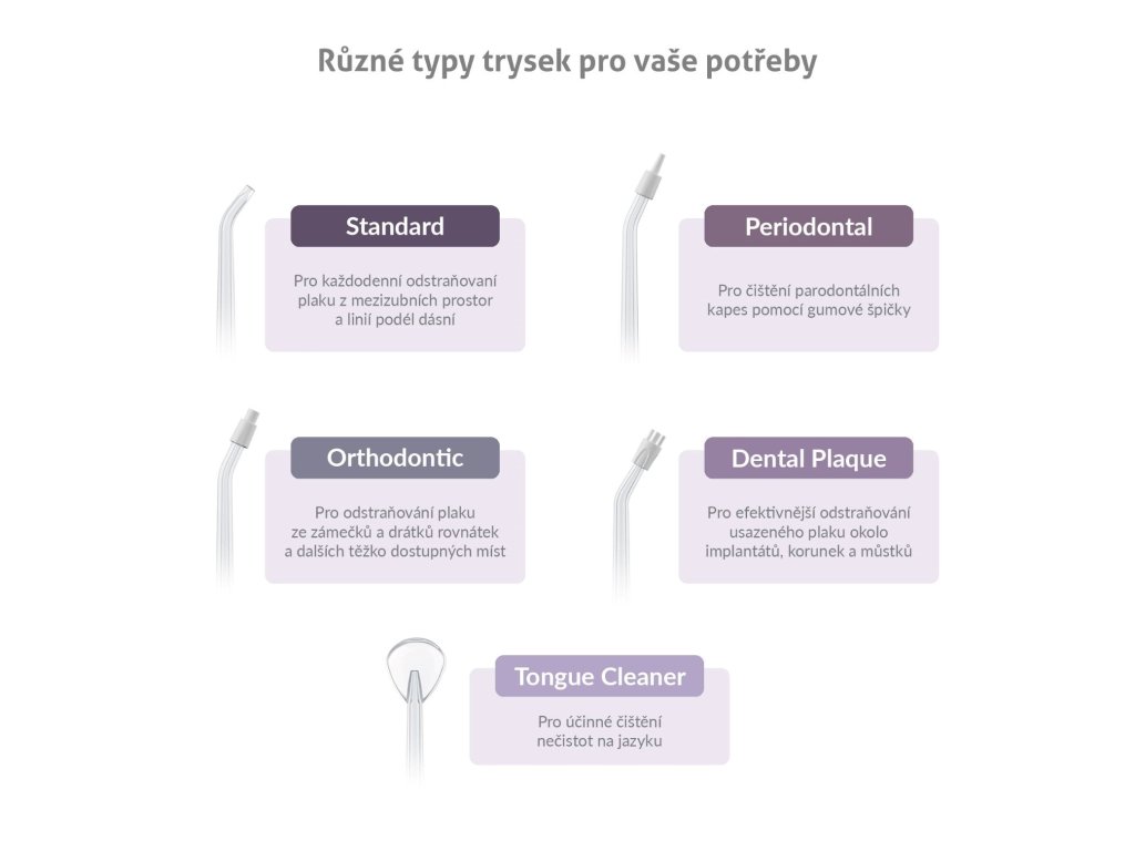 Součástí sprchy je 6 speciálních trysek (2× Standard, 1× Orthodontic, 1× Periodontal, 1× Dental Plaque, 1× Tongue Cleaner), navržené pro různé potřeby: