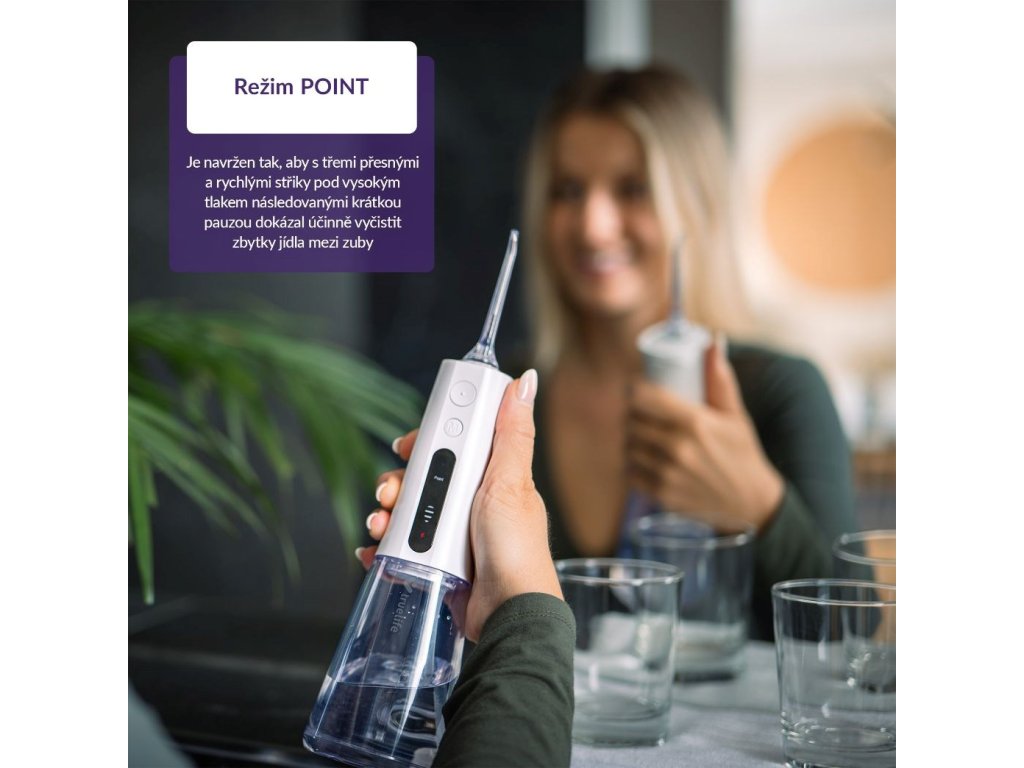 Šetrnější řešení ve všech směrech představuje ústní sprcha TrueLife AquaFloss Compact L100 disponující 3 režimy čištění, především režimem POINT, který cíleně a účinně odstraní zbytky jídla z mezizubních prostor.
