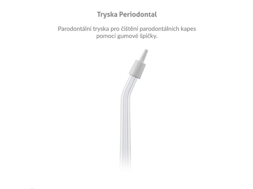 Periodontální tryska pro čištění parodontálních kapes pomocí gumového hrotu.