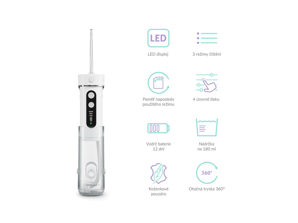 Ústní sprcha, 3 režimy čištění, 4 intenzity tlaku, otočná hlavice o 360°, nádržka 180 ml, 12 dní provozu na jedno nabití, paměť, časovač, 6 trysek v balení, krytí IPX7, bílá