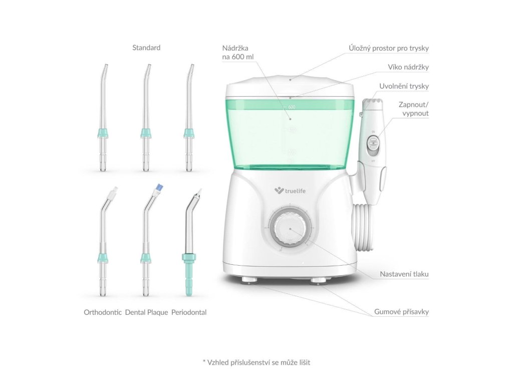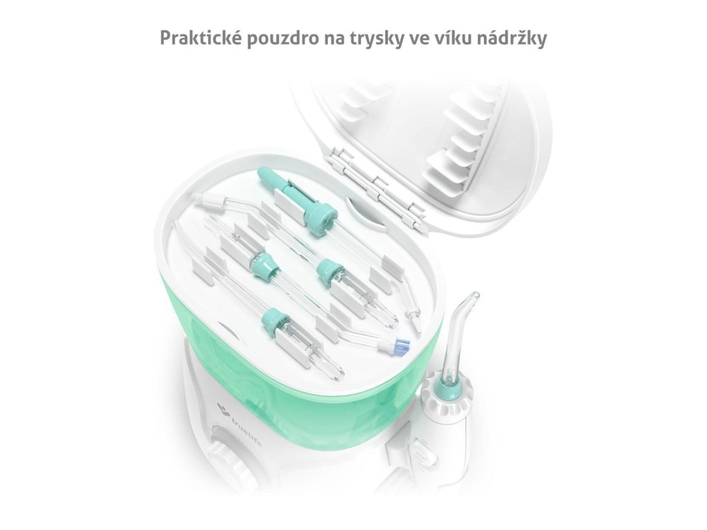 Elektrická ústní sprcha - ústní centrum, pro můstky, korunky a rovnátka, 10 programů, trysky standardní, ortodontické, periodontální a na jazyk, 6 trysek v balení, objem nádržky 600 ml, časovač, režim jednotný proud a masážní, síťové napájení