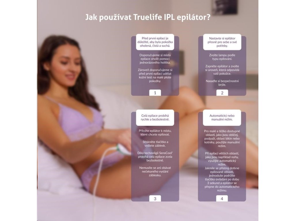 Je-li vaše pokožka velmi citlivá, nemusíte se používání epilátoru TrueLife BELLE IPL E3 obávat. Díky technologii SensCool® probíhá celé ošetření zcela bezbolestnou metodou. Mimo to SensCool® hlídá teplotu epilátoru a jakmile je překročena teplota 60 °C, epilátor se automaticky vypne. Senzor na ochranu očí brání vyslání záblesku, pokud epilátor míří do volného prostoru. Epilátor vydá impulz pouze ve chvíli, kdy je v přímém kontaktu s pokožkou.