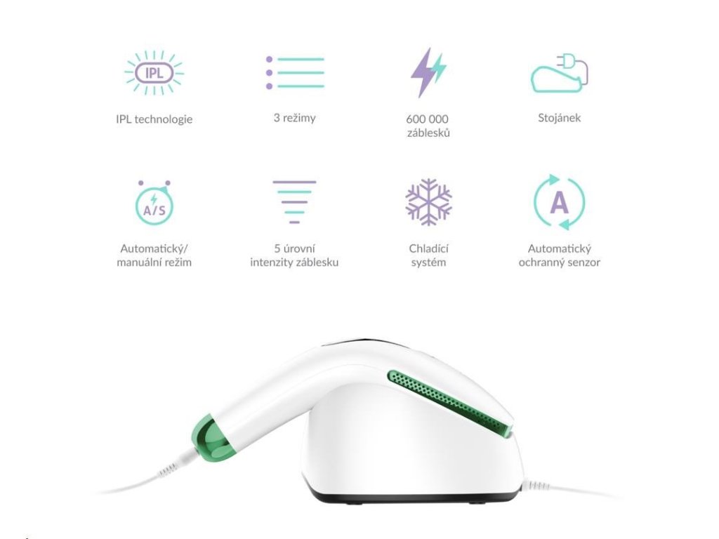 IPL epilátor, 3 druhy lamp (HR k odstraňování chloupků, SR k omlazování pokožky, AC k odstranění akné), automatický a manuální režim, bezbolestný, dotykový LCD displej, automatická ochrana proti přehřátí
