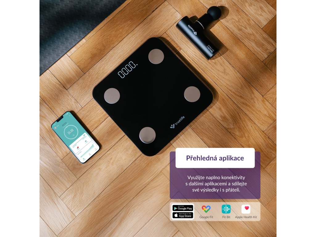 Chytrá váha TrueLife FitScale W1 BT Black měří pomocí bioelektrické impedanční analýzy (BIA) celkovou tělesnou kompozici, díky čemuž zjistíte kromě hmotnosti i další informace jako poměr svalové hmoty, tuku, vody. Celkově je k dispozici 20 měřitelných indexů, jejichž vysvětlení najdete v aplikaci Fitdays, která poskytuje kompletní a přehledný report o stavu vašeho zdraví a kondice, zároveň navrhuje cesty ke zlepšení. Propojení váhy s aplikací probíhá přes Bluetooth a data se poté automaticky synchronizují.