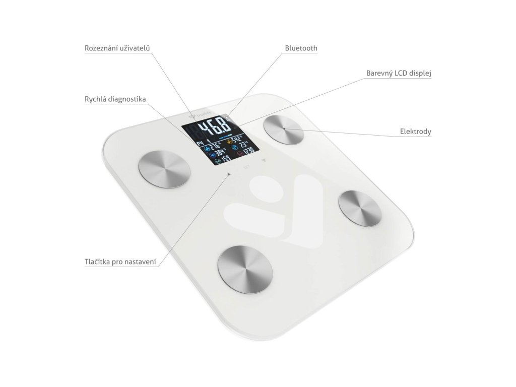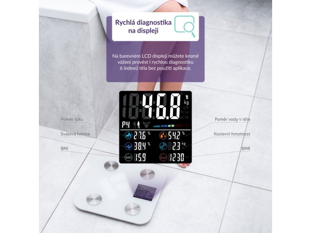 Osobní diagnostická bluetooth váha, měření pomocí bioelektrické impedanční analýzy, 19 měřitelných indexů těla, barevný LCD displej, až 8 uživatelů, párování váhy s mobilní aplikací pomocí bluetooth, kompatibilita s iOS a Android