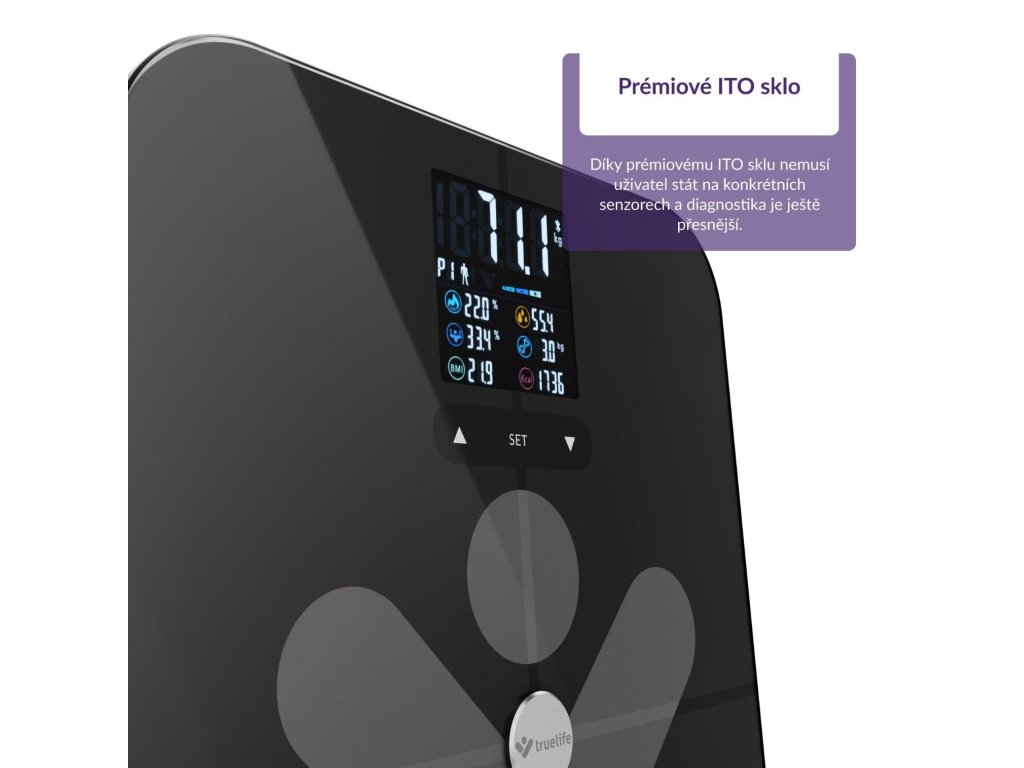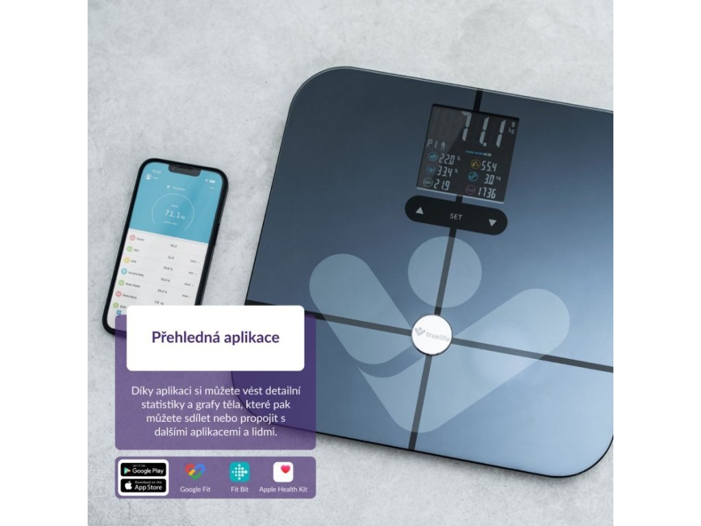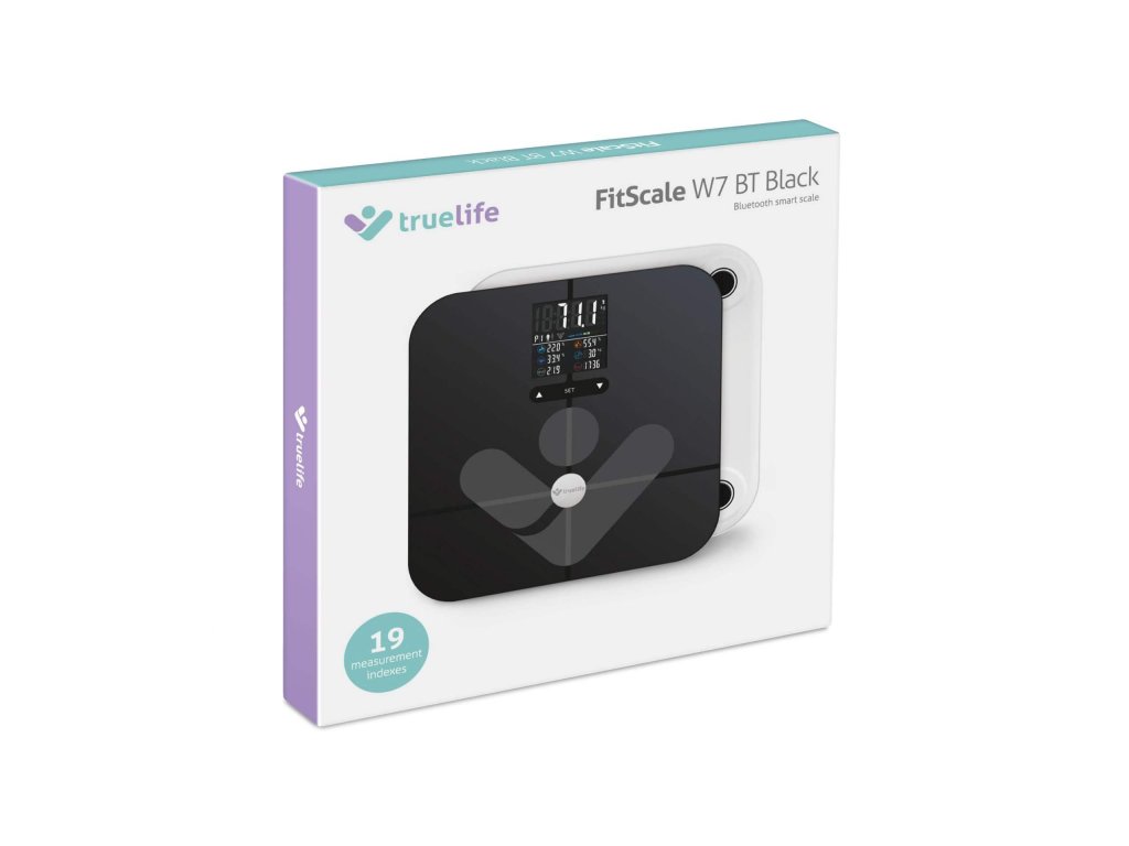 Svůj zdravý životní styl nejlépe podpoříte, budete-li dokonale rozumět svému tělu. Pomoci vám v tom může inteligentní váha TrueLife FitScale W7 BT. Kromě zjištění hmotnosti, provede také diagnostiku pomocí bioelektrické impedanční analýzy a vypočítá 19 měřitelných indexů, z toho 7 i bez použití aplikace. Své výsledky vidí uživatel na přehledném barevném LCD displeji. Váhu lze propojit prostřednictvím Bluetooth s mobilním telefonem a stažením aplikace získáte ještě detailnější přehled o tom, co se s vaším tělem děje. Váha je vyrobena z tvrzeného ITO skla, které je velmi odolné a má nosnost až 180 kg. Zaměřte se na své zdraví komplexně, pouhá hmotnost není tím hlavním ukazatelem.