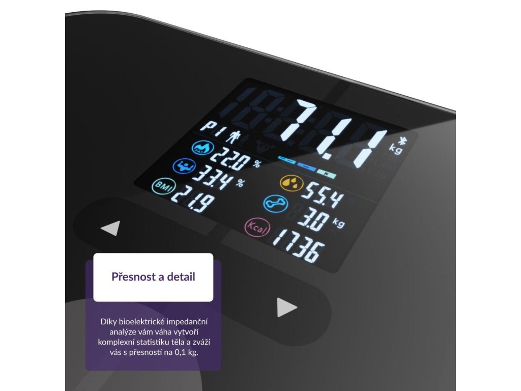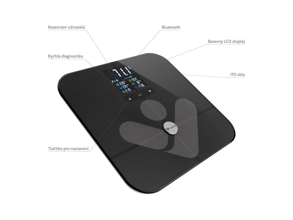 Osobní diagnostická bluetooth váha, měření pomocí bioelektrické impedanční analýzy, 19 měřitelných indexů těla, barevný LCD displej, až 8 uživatelů, párování váhy s mobilní aplikací pomocí bluetooth, kompatibilita s iOS a Android