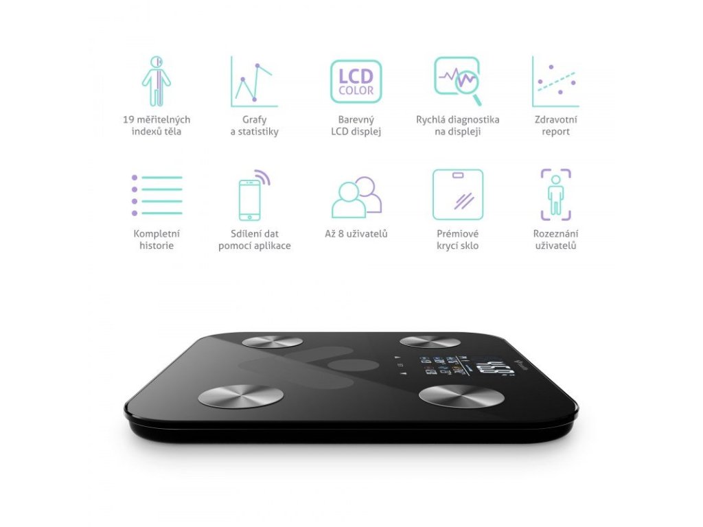 Osobní diagnostická bluetooth váha s bioelektrickou impedanční analýzou, nabízí 19 tělesných indexů a barevný LCD displej. Umožňuje připojení až 8 uživatelů a párování s mobilní aplikací přes bluetooth. Kompatibilní s iOS a Android.