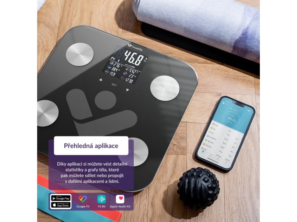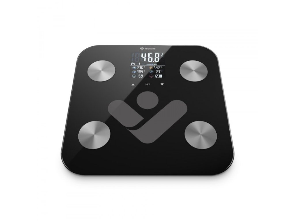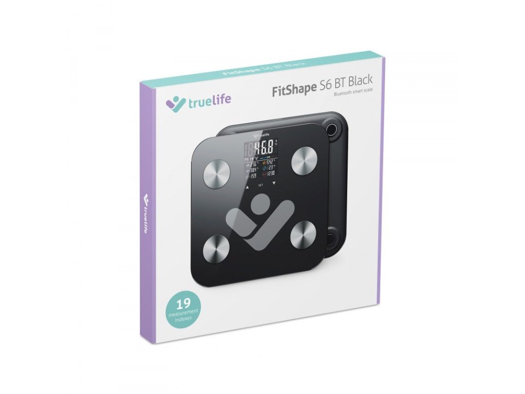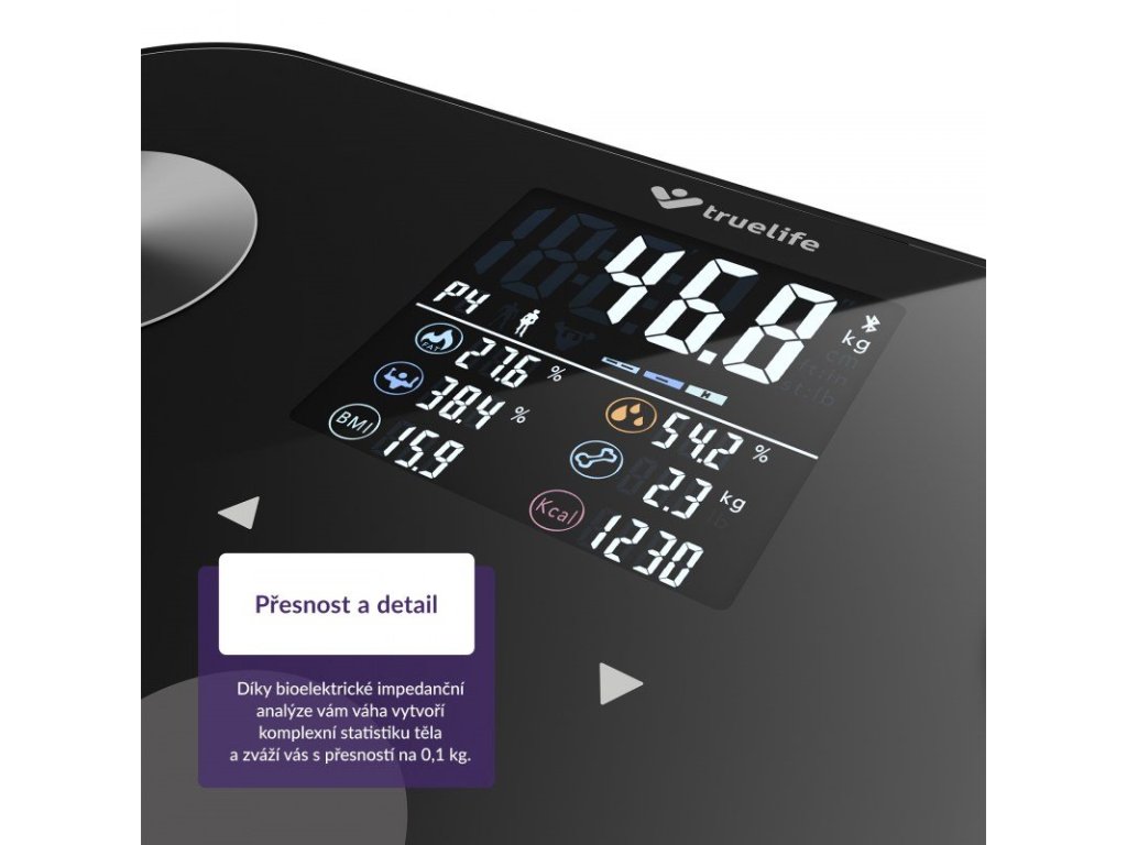 Pouhá hmotnost vám příliš neřekne. Osobní váha TrueLife FitShape S6 BT Black umí víc a dává možnost poznat tělo do detailu. Kromě přesného údaje o aktuální hmotnosti poskytuje díky bioelektrické impedanční analýze také řadu dalších důležitých informací. Přehledný barevný LCD displej se 7 indexy těla viditelně zobrazí potřebné hodnoty. Tato rychlá diagnostika prozradí o těle mnohé, ovšem ještě detailnější popis všech, tedy až 19 měřitelných tělesných indexů, získáte prostřednictvím mobilní aplikace. Váhu pouze přes Bluetooth propojíte s telefonem a hned máte k dispozici kompletní reporting o těle a statistiky. Váha je dokonce tak inteligentní, že automaticky rozezná uživatele. Její prémiové krycí sklo odolá hmotnosti až 180 kg.