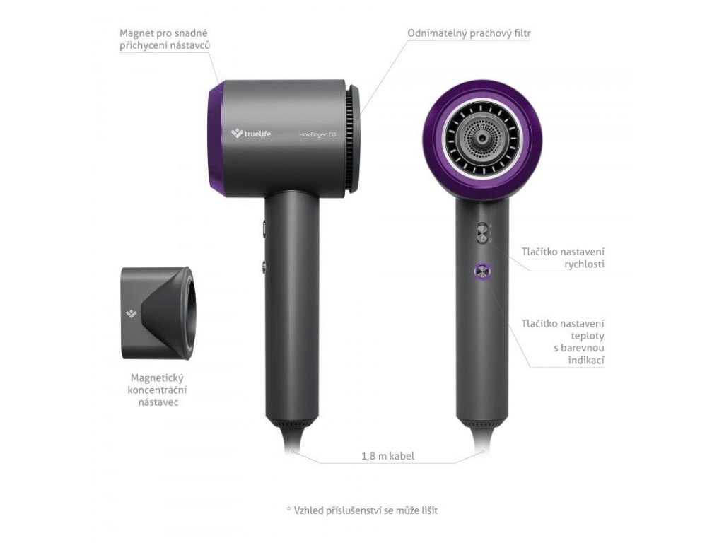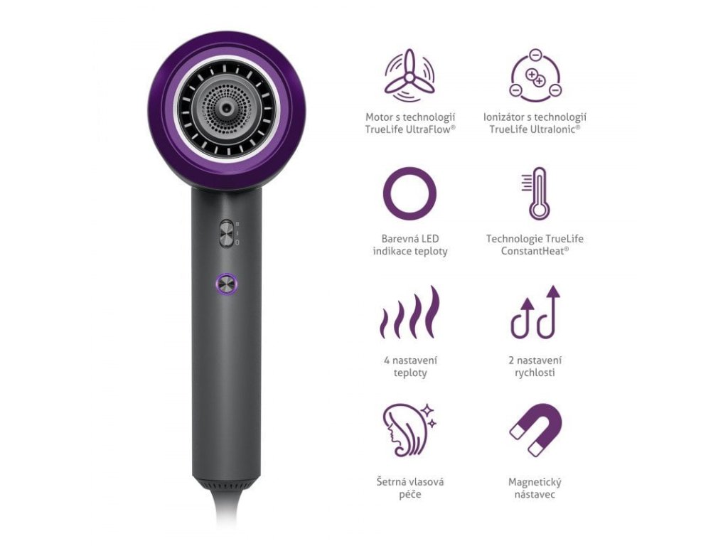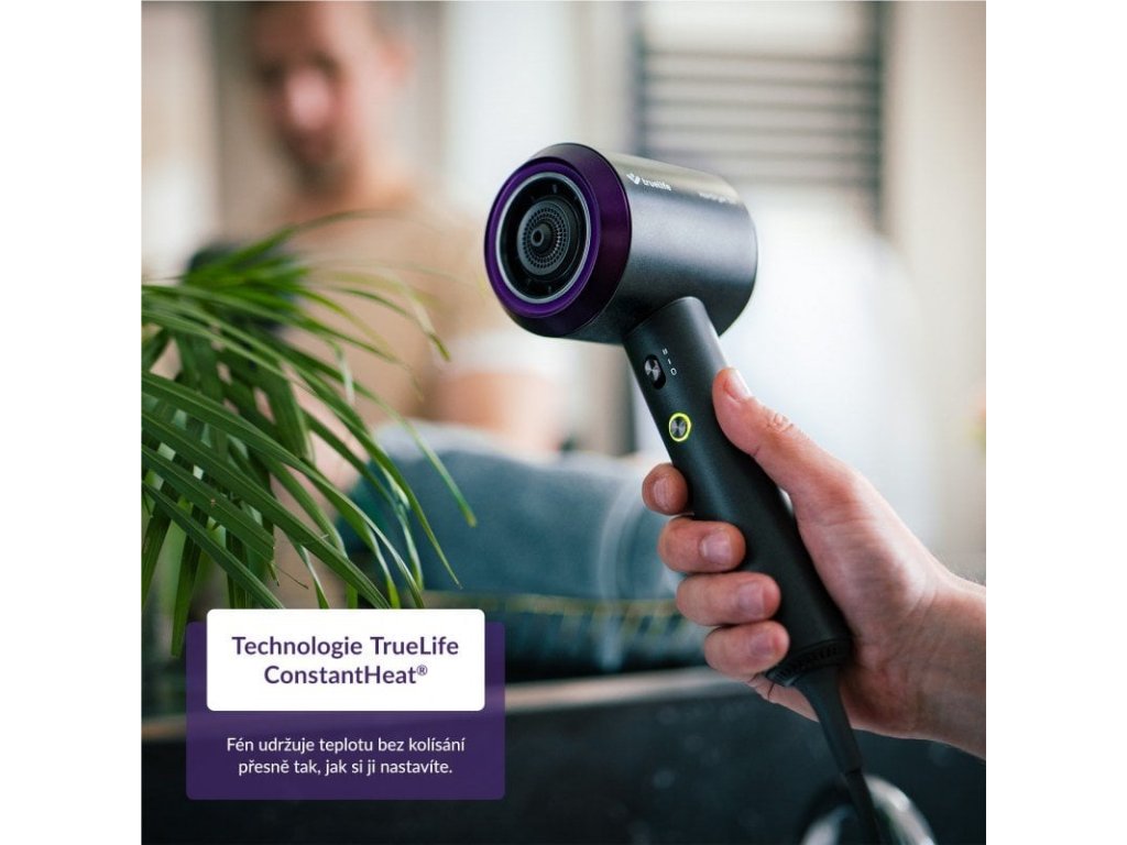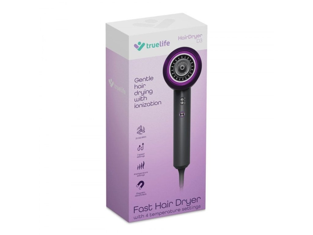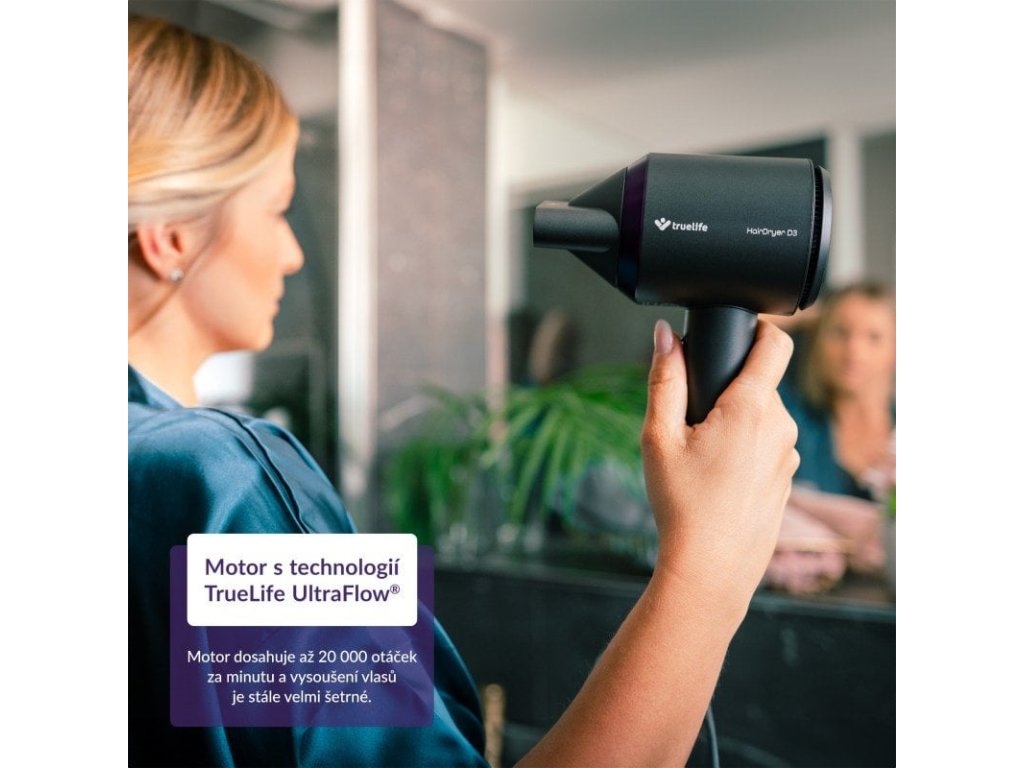 Fén TrueLife HairDryer D3 pracuje díky výkonnému motoru s technologií TrueLife UltraFlow® rychlostí až 20 000 otáček za minutu, přitom však o vlasy pečuje jako profesionální kadeřník. Ke krásným a zdravým vlasům přispívá také ionizátor s technologií TrueLife UltraIonic® vyzařující přibližně 40 milionů záporných iontů působících i uvnitř vlasu. Díky tomu stačí vysoušet kratší dobu a na nižší teplotu, jejíž aktuální nastavení indikuje barevný LED kroužek okolo tlačítka, kde modrá barva indikuje studený vzduch, zelená normální, fialová teplý a červená horký vzduch.