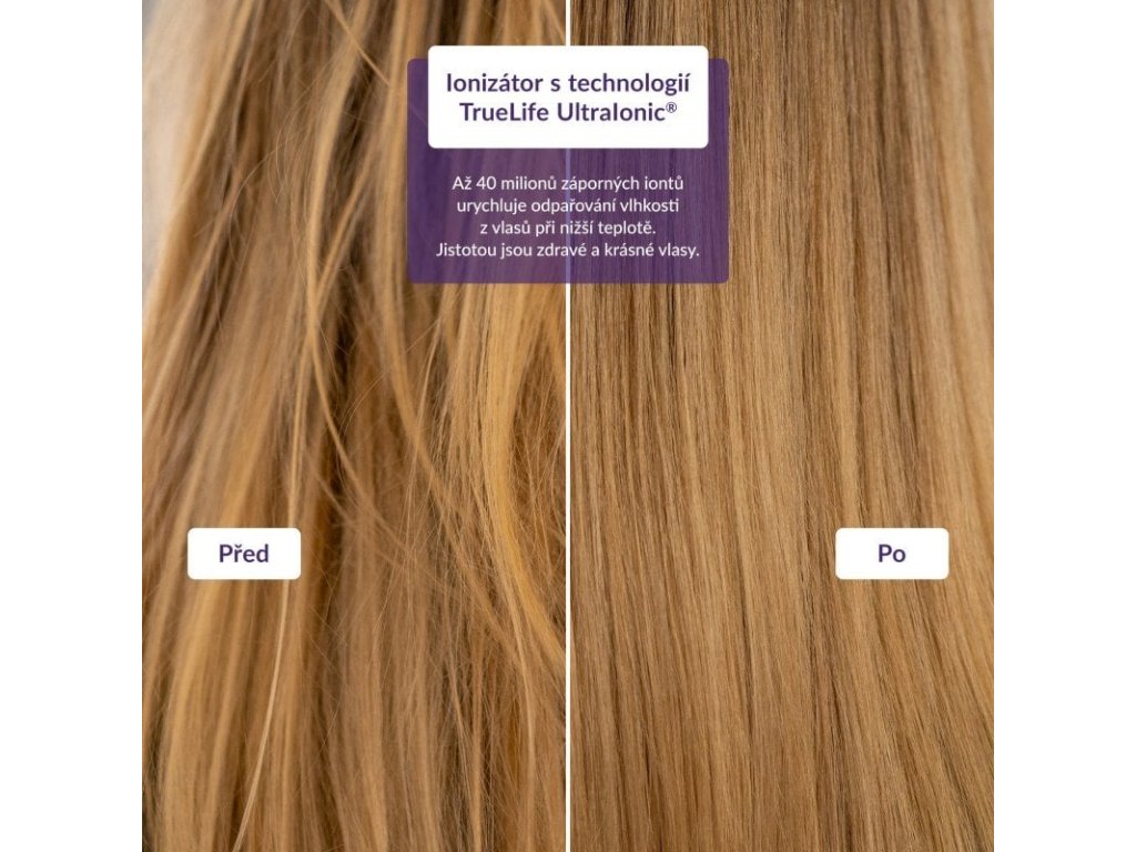 Pečujte o své vlasy s profesionálním přístrojem. Fén s ionizátorem TrueLife HairDryer D3 přináší kousek kadeřnického salonu přímo do vaší koupelny. Jeho motor s technologií TrueLife UltraFlow® pracuje o výkonu až úctyhodných 20 000 otáček za minutu. Ionizátor s technologií TrueLife UltraIonic® vyzařující přibližně 40 milionů záporných iontů je zárukou hebkých a zdravých vlasů, ať využijete jakoukoliv ze 2 rychlostí a 4 možných teplot. Aktuálně zvolenou teplotu indikuje barevný LED kroužek kolem tlačítka. Technologie TrueLife ConstantHeat® zabraňuje kolísání teploty, čímž jsou vlasy ještě víc chráněny. Součástí balení je i magnetický koncentrační nástavec pro cílený styling. Chod fénu je velmi tichý a díky ochraně proti přehřátí také bezpečný. Potěší snadnou údržbou, kdy odnímatelný prachový filtr stačí odšroubovat a vyčistit. Samozřejmostí je i dostatečně dlouhý kabel.