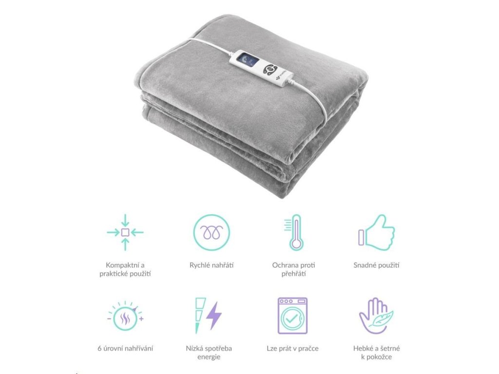 Vyhřívaná deka, povrch z microfleecu, rozměry 180x130 cm, 6 stupňů nahřívání, časovač na 1-12 hodin, automatické vypnutí, funkce Fast Hear, rychlé a rovnoměrné nahřátí