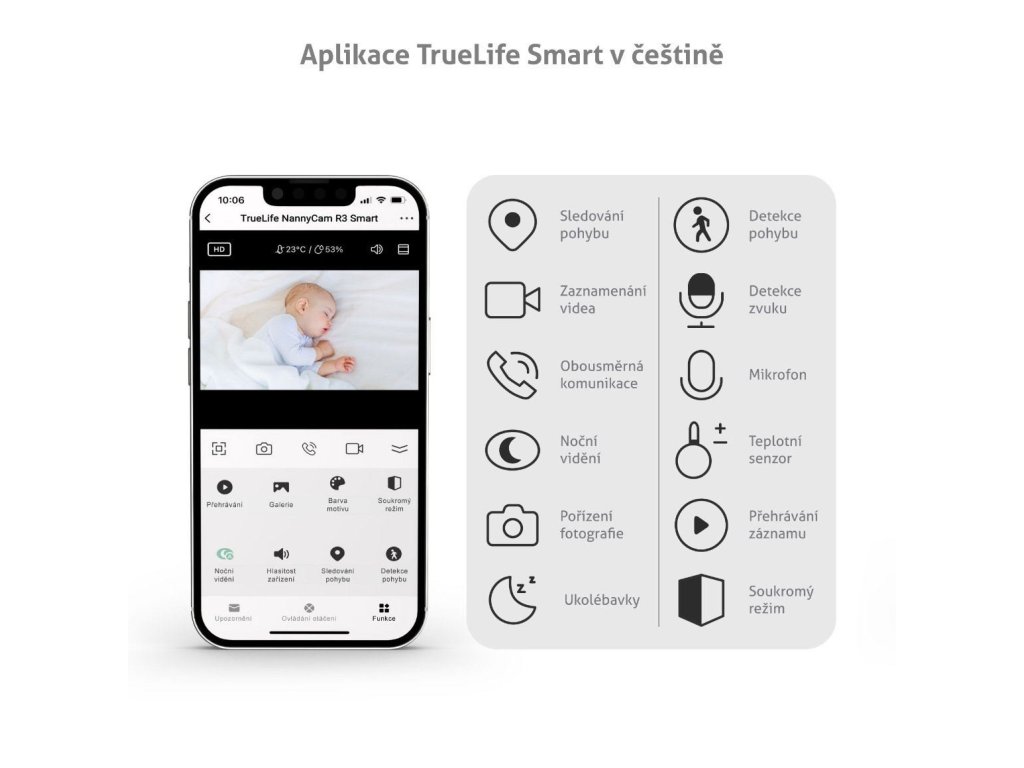 Dopřejte si klidu, protože víte, že je vaše děťátko v pořádku. Nenápadný strážce miminek i starších dětí v podobě chůvičky TrueLife NannyCam R3 Smart se postará, že budete mít svou ratolest neustále na očích, ať už jste kdekoliv. Chůvičku snadno spárujete se svým mobilním telefonem a v aplikaci TrueLife Smart, která je kompletně v českém jazyce. Můžete nejen sledovat, co dítě právě dělá, ale rovněž nastavit různé chytré funkce. Vše je snadné, rychlé a bezpečné. Rotační chůvička nepřetržitě monitoruje prostor, kde se dítě nachází a poskytuje obraz ve Full HD kvalitě. Umí detekovat pohyb, zvuk i teplotu a v pravý čas upozornit, když se něco děje. Ukolébavky zase pomohou vaše děťátko uspat a vytvořit mu příjemné prostředí.