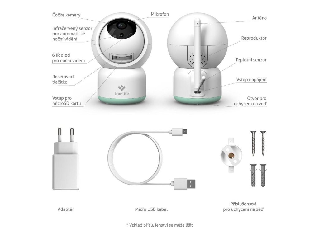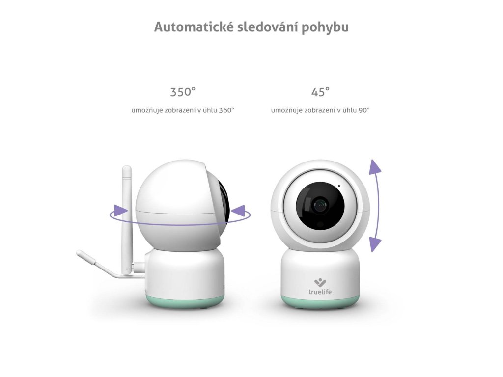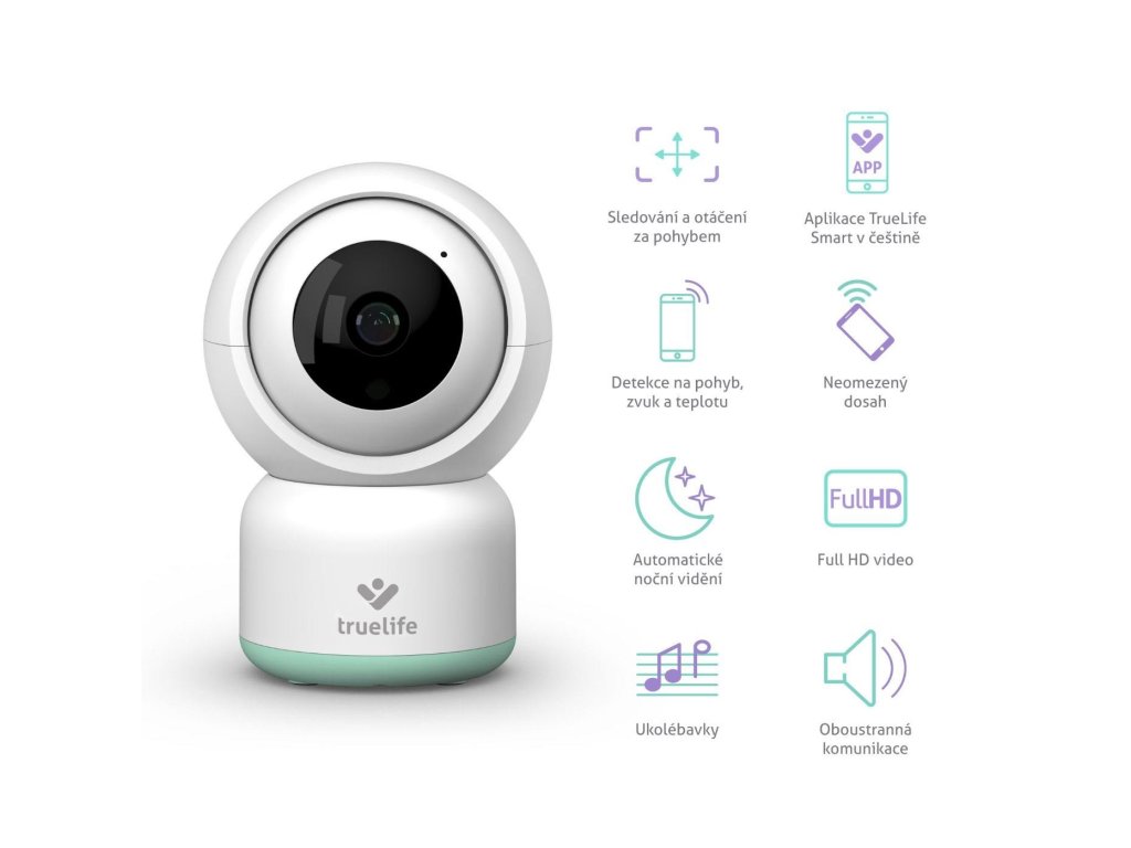 Rotační chůvička s aplikací TrueLife Smart v českém jazyce, neomezený dosah, Full HD video, detekce pohybu, zvuku a teploty, sledování a otáčení za pohybem, automatické noční vidění, obousměrná komunikace