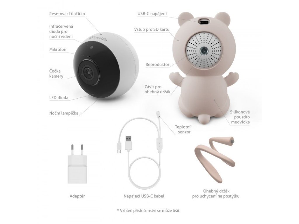 Další funkce Neomezený dosah díky online Wi-Fi zobrazení, aplikace TrueLife Smart v češtině, ukolébavky, automatické noční vidění, obousměrná komunikace, detekce na pohyb, zvuk a teplotu (oznámení v telefonu), pořízení fotografií a videí (uloží se do galerie pořízených záznamů), nepřetržité nahrávání videa 24/7 na microSD kartu, nastavení kvality přenosu videa (SD/HD), přiblížení obrazu, nastavení hlasitosti, noční lampička, silikonové pouzdro, závit pro uchycení držáku v balení, sdílení účtu s více členy domácnosti, zabezpečení proti hacknutí s pětivrstvou bezpečnostní technologií, možnost cloudového uložiště