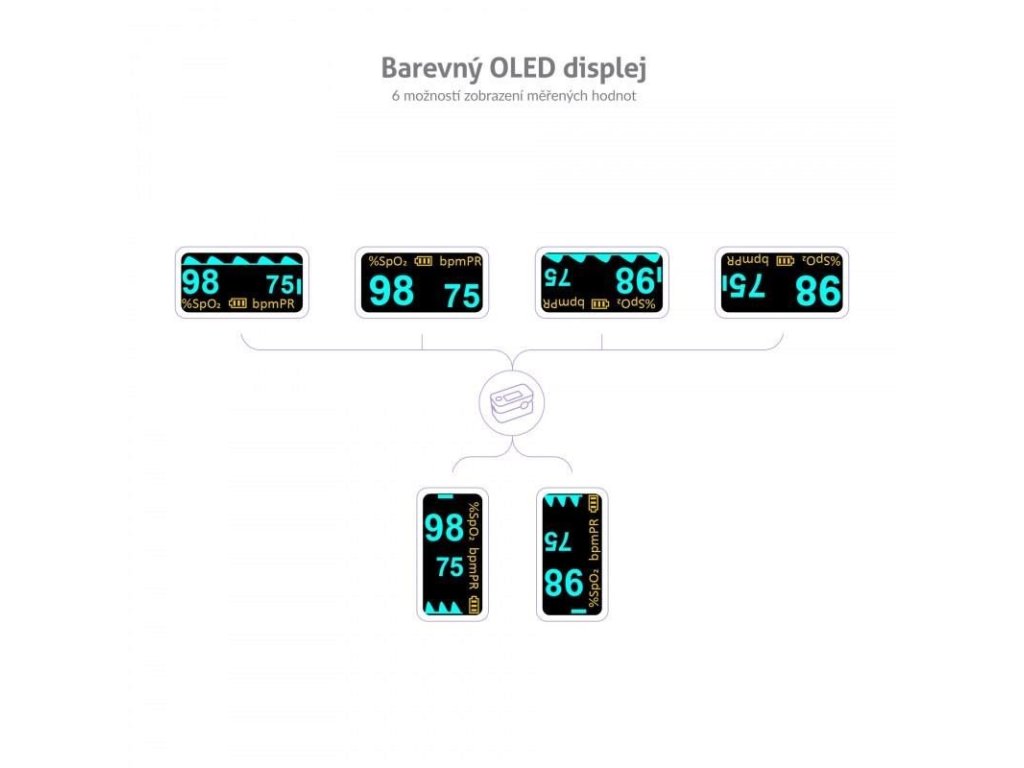 Oxymetr X3 disponuje přehledným OLED displejem, jehož nastavení lze přizpůsobit dle vašich preferencí. Na výběr je 6 možností zobrazení měřených hodnot. Nastavit můžete i preferovanou intenzitu jasu, zvukový indikátor, či zvukový doprovod tepu.