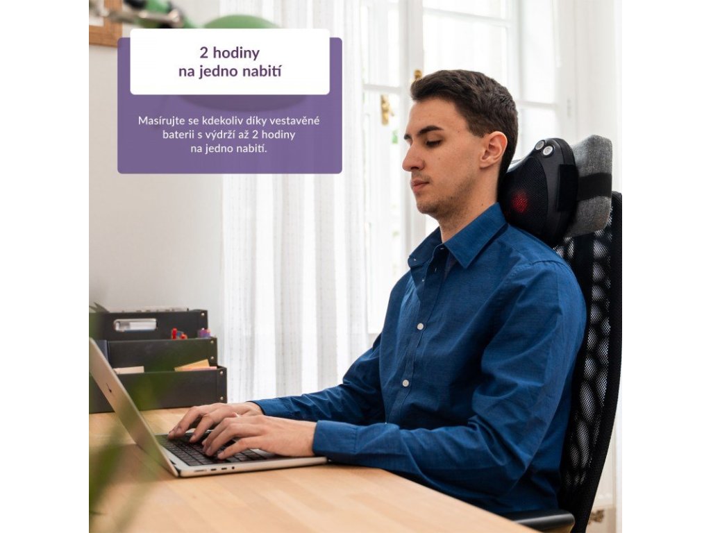 Masážní polštář sice primárně využijete doma pro relaxaci, vzít si jej však můžete i do kanceláře, kde pomůže ulevit od bolestí způsobených sezením. Díky vestavěné baterii, která vydrží až 2 hodiny činnosti, si můžete masáž dopřát i na dlouhých cestách. Pak jen stačí dobít prostřednictvím USB-C kabelu. Uplatnění nalezne RelaxBack B3 Charge jednoduše kdykoliv a kdekoliv.