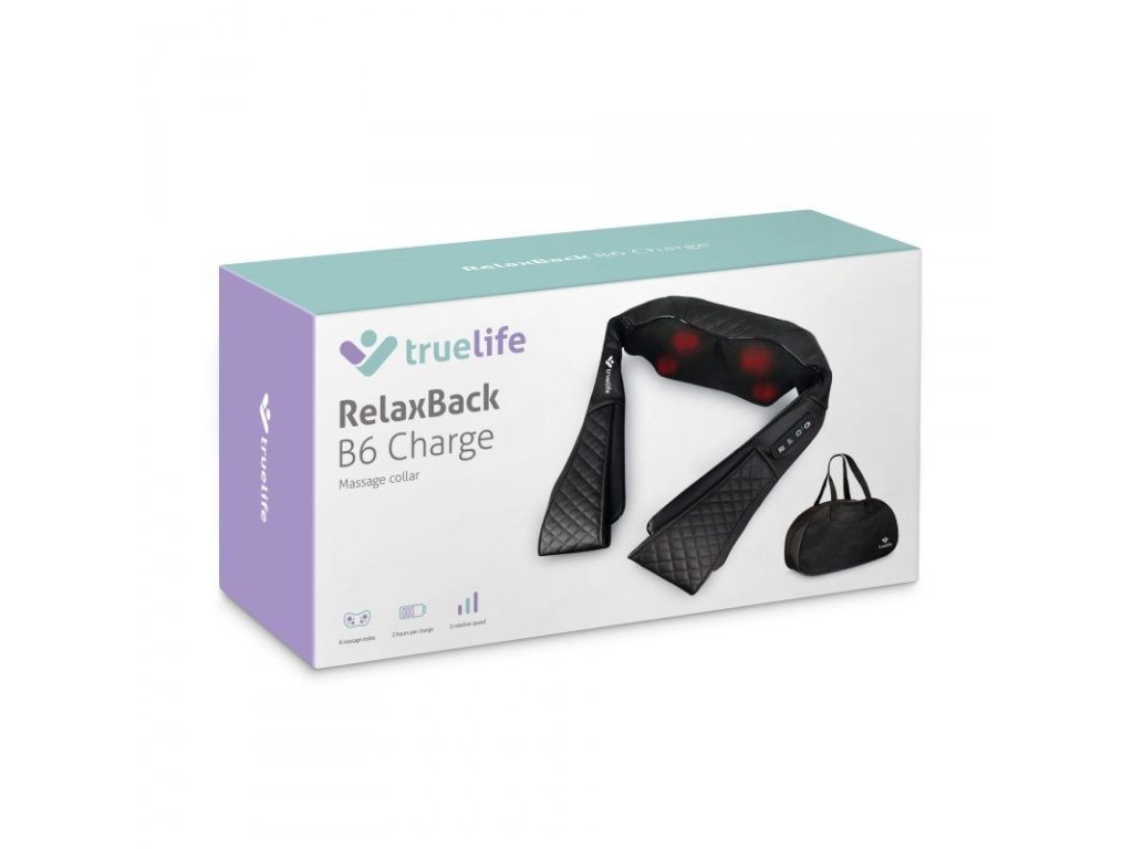 Díky TrueLife RelaxBack B6 Charge máte zaručeny stálé masérské služby v pohodlí domova, ale i v autě nebo v kanceláři. Dvě rotační hlavice s osmi nahřívacími hloubkovými masážními uzly poskytují zážitek jako při hloubkové Shiatsu masáži. Masážní přístroj pomáhá ulevovat od svalového napětí a stresu, napomáhá regeneraci svalů po sportovním výkonu, zlepšení cirkulace krve, rozsahu pohybu či aktivaci nervového a svalového systému. Masáž je velmi nápomocná rovněž při křečích, migrénách či snižování kyseliny mléčné při sportovní zátěži. Masáže ještě umocní možnost vyhřívání, kdy tepelná terapie jemným teplem zklidňuje bolavé svaly a zlepšuje krevní oběh.