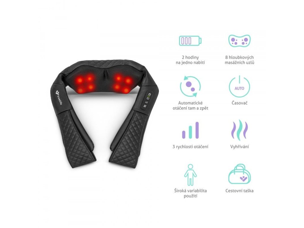 Uspěchaná doba, hektický životní styl a často sedavá zaměstnání našemu zdraví nepřidávají. Proto se nesmíme zapomínat i trochu hýčkat. Právě pro tyto okamžiky přichází na scénu TrueLife RelaxBack B6 Charge, masážní přístroj, jenž napomáhá zmírňovat bolesti zad a šíje, regenerovat svaly a uvolňovat napětí a stres. Přístroj disponuje vyhříváním, které lze využít jako tepelnou terapii pro zklidnění bolavých svalů a zlepšení krevního oběhu. Masážní hlavy mají 3 úrovně rychlosti otáčení. Dvě rotační hlavice se čtyřmi nahřívacími hloubkovými masážními uzly poskytují pocit jako při masáži Shiatsu. Přístroj lze díky jeho ergonomickému designu ve tvaru U použít pro masáž celého těla, k čemuž přispívají také 3D rotační hnětací masážní uzly. Speciální držáky na ruce umožňují více stáhnout masírované místo pro větší účinnost. Časovač je nastaven na 15 minut masáže, přičemž každou minutu automaticky dochází ke změně směru otáčení. Přístroj má vestavěnou baterii s výdrží až 2 hodiny na jedno nabití, takže jej bez problémů lze používat i v autě. Jeho provoz je tichý a údržba snadná, stačí otřít hadříkem. Praktická je též cestovní taška.