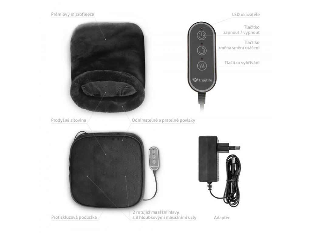Nosí nás každý den a my jim věnujeme zpravidla velmi malou pozornost, dokud nezačnou bolet. Řeč je o našich nohách. TrueLife RelaxFeet F3 představuje řešení, jež uvolní chodidla, prsty a spodní paty, čímž napomáhá od problémů se studenými nohami či potížemi spojenými s dlouhodobým stáním. Dvě rotující masážní hlavice s osmi nahřívacími masážními uzly zajistí příjemnou masáž napomáhající úlevě od chronických bolestí, stresu a dalších neduhů. Rotace hlavic lze zvolit jedním nebo druhým směrem, přičemž masáž trvá 15 minut. Po jejich uplynutí se přístroj automaticky vypne díky časovači. Celkový komfort masáže zlepší možnost vyhřívání, kterého však jde využít i samostatně bez masírování. Díky integrovanému zipu lze odejmout vrchní část a přístroj použít i pro masáž zad. Povlak je vyroben z příjemného microfleecu a lze ho vyprat v pračce.