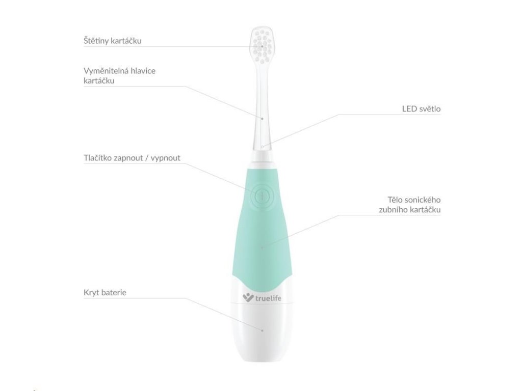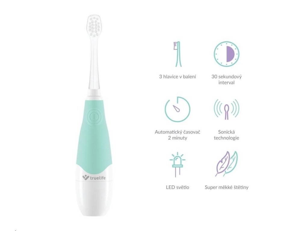 Na pravidelnou péči o zoubky by si měly zvykat i nejmenší děti. Ovšem přesvědčit vaše dítě, aby si dobrovolně čistilo zuby, může být občas oříšek. Většina dětí si čištění zubů příliš neužívá a tak ho často jen tak odbyde. Se sonickým kartáčkem Truelife SonicBrush Baby G, který je uzpůsoben potřebám dětí od 3 do 6 let, může být ale čištění zubů i zábava. Díky 30 samolepkám zvířátek a zábavné výukové video animaci snadno proměníte rutinní činnost v legraci a vaše dítě se bude na čištění zubů těšit. Kartáček je plně přizpůsoben dětským potřebám, tělo i hlavice kartáčku mají vhodnou velikost pro dětská ústa a štětiny kartáčku jsou pro děti dostatečně jemné. Kartáček je napájen z obyčejné AAA baterie, takže s ním můžete pohodlně cestovat.