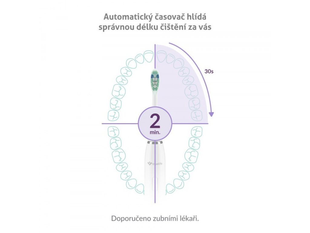 Sonické kartáčky TrueLife SonicBrush Clean30 obsažené v sadě disponují 5 režimy čištění, jež usnadňují každodenní péči o zuby a dásně. Běžné čištění obstará režim Clean, s odolnějším zubním plakem zatočí režim Whiten, který zároveň přispívá k bělení zubů. Dokonale zářivý úsměv zajistí režim Shine efektivně odstraňující pigmentové skvrny způsobené například kávou či čajem. Patříte-li k lidem s citlivějšími zuby a dásněmi, pak oceníte režim Sensitive. Ke zdravějším dásním přispěje režim Massage, a to jejich stimulací. Ideální doba čištění jsou 2 minuty, hlídat je ale nemusíte, časovač to obstará za vás. Také vždy po 30 sekundách upozorní, že je čas přesunout se na další část chrupu.