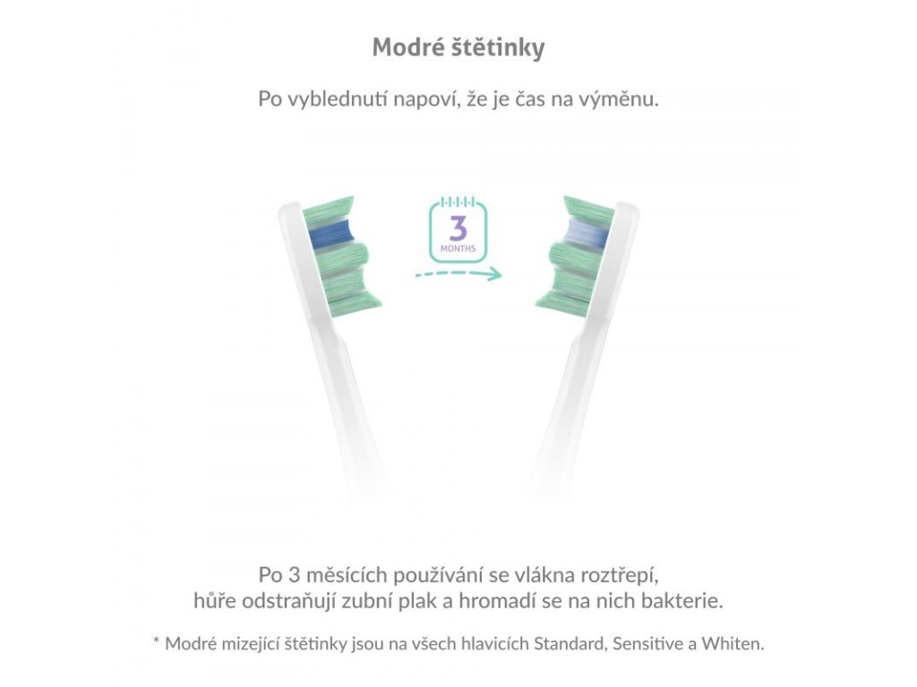 Zhruba po 3 měsících je třeba vyměnit hlavici kartáčku, aby byla zajištěna kvalita čistění. Poznáte to dle modrých štětinek, které postupně bělají.
