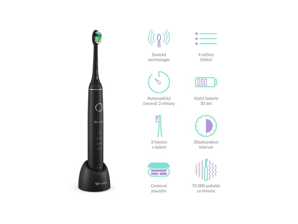 Elektrický zubní kartáček - sonický, 70000 kmitů/min, 4 režimy, časovač a indikátor baterie, v balení 3 hlavice, cestovní pouzdro