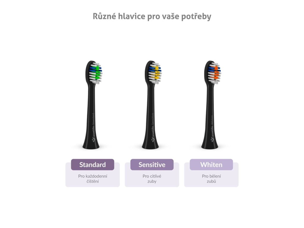 Součástí balení jsou 3 náhradní hlavice Compact různých typů – Standard pro běžné čištění, Sensitive pro citlivější zuby a Whiten pro bělící efekt.