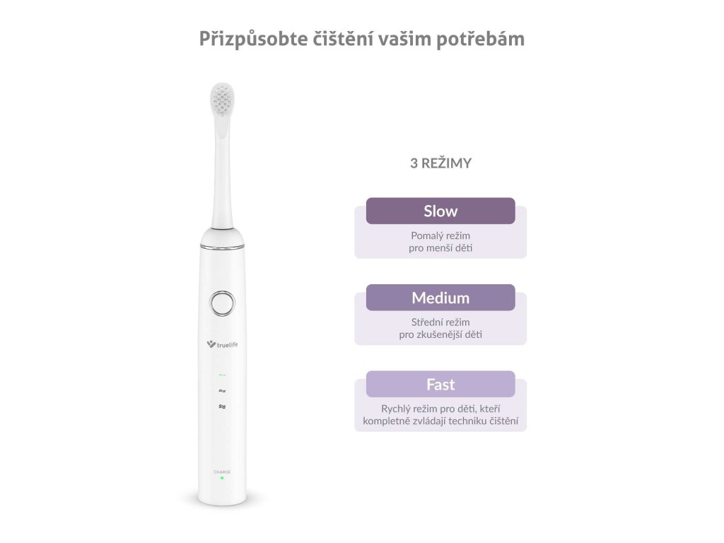 Sonický kartáček TrueLife je svou velikostí i jemností štětin perfektně vhodný pro čištění dětských zubů. Kartáček padne dětem skvěle do ruky a čištění je pro ně snadné. Nabízí 3 režimy čištění – od pomalého pro menší děti po rychlejší pro starší děti, kteří si zuby čistí kompletně samy a zvládají techniku.