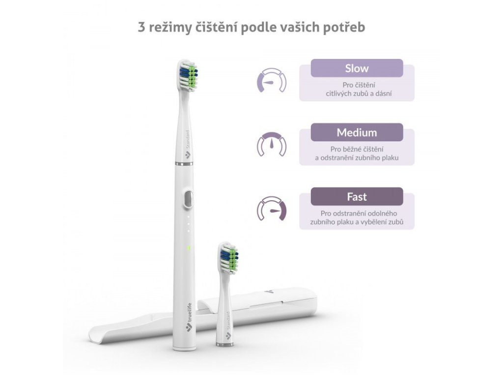 Sonický kartáček disponuje 3 režimy čištění. SLOW ocení lidé s citlivými zuby a dásněmi, MEDIUM je ideální na běžné čištění a odstranění zubního plaku, FAST odstraní i odolný zubní plak a bělí zuby.