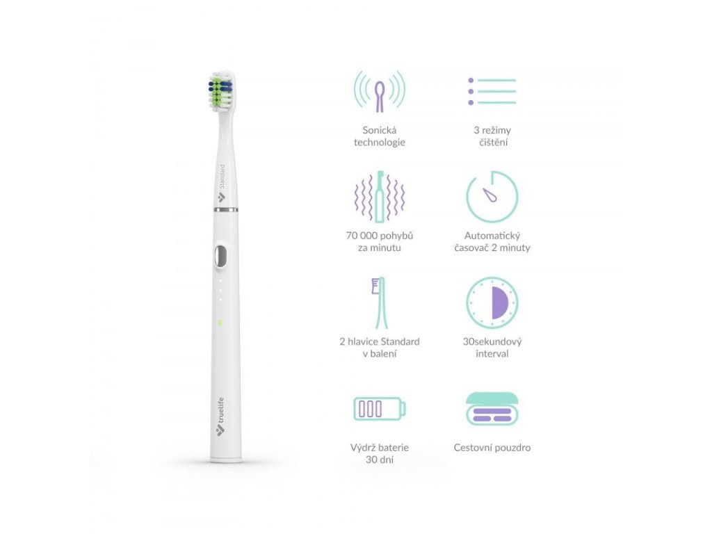TrueLife SonicBrush Slim20 disponuje sonickou technologií SonicTrue ®, která efektivně a zároveň šetrně pomocí jemných vibrací bojuje proti zubnímu plaku. Hlava kartáčku kmitá rychlostí až 70 000 pohybů za minutu a vířením vody se zubní pastou dochází k čištění i mezizubních a hůře dostupných prostor. Balení obsahuje hned 2 čisticí hlavice, z nichž každá vydrží až 3 měsíce používání. Moment pro její výměnu indikují speciální modré štětiny, které postupně blednou. Máte tak jistotu, že se nesníží účinnost čištění.